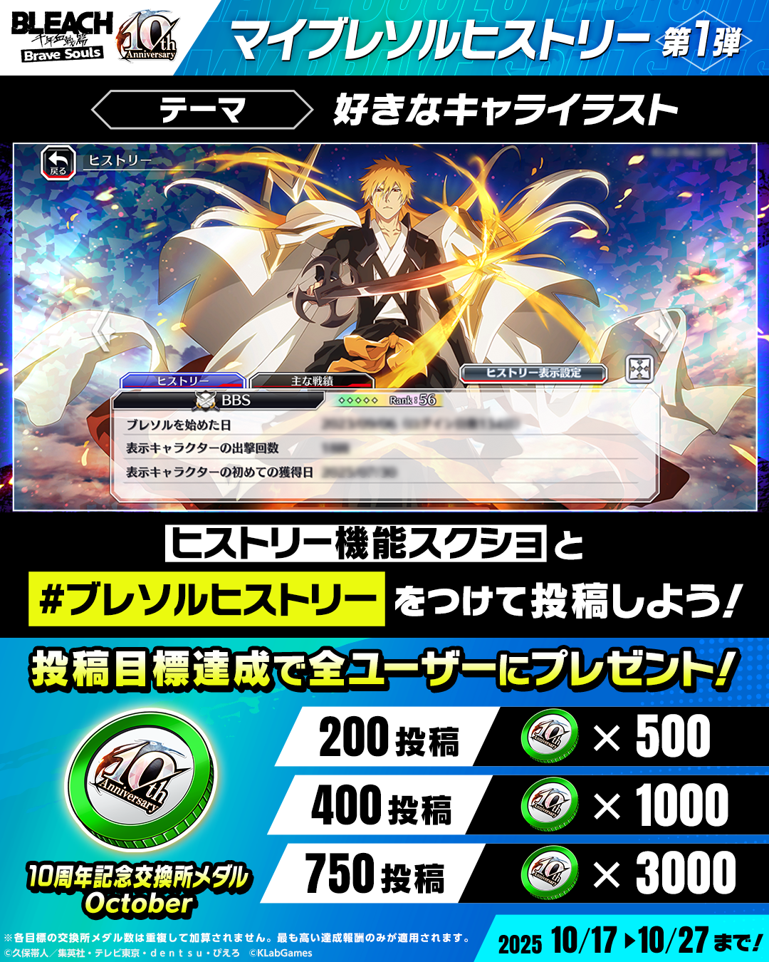3. ヒストリー画面のスクショを撮影し、公式アカウント(@bleachbravesouls_official)をタグ付けしてストーリーズへ投稿