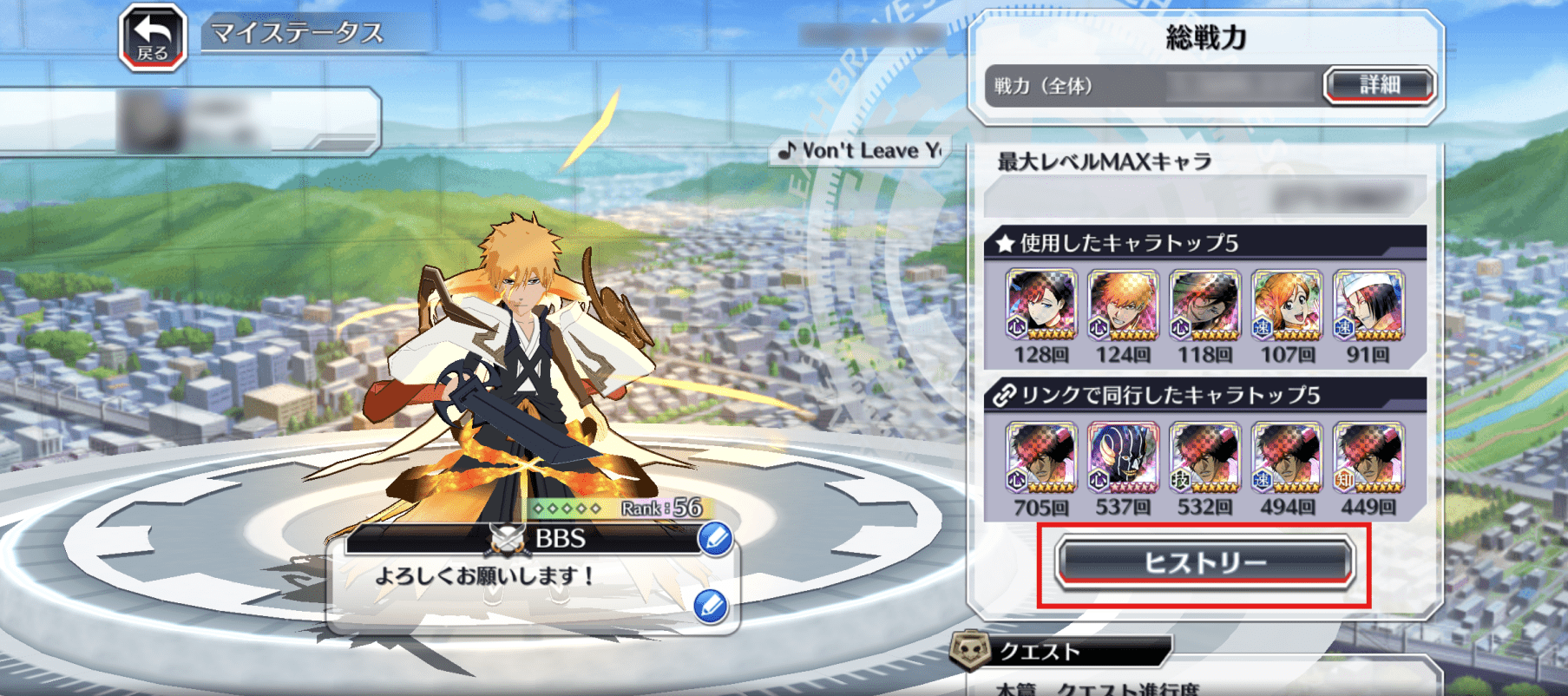 ・現在チーム1に設定しているキャラクターのヒストリーが表示されます。