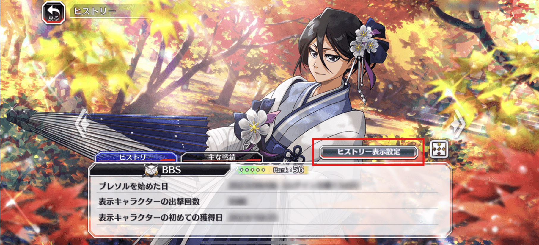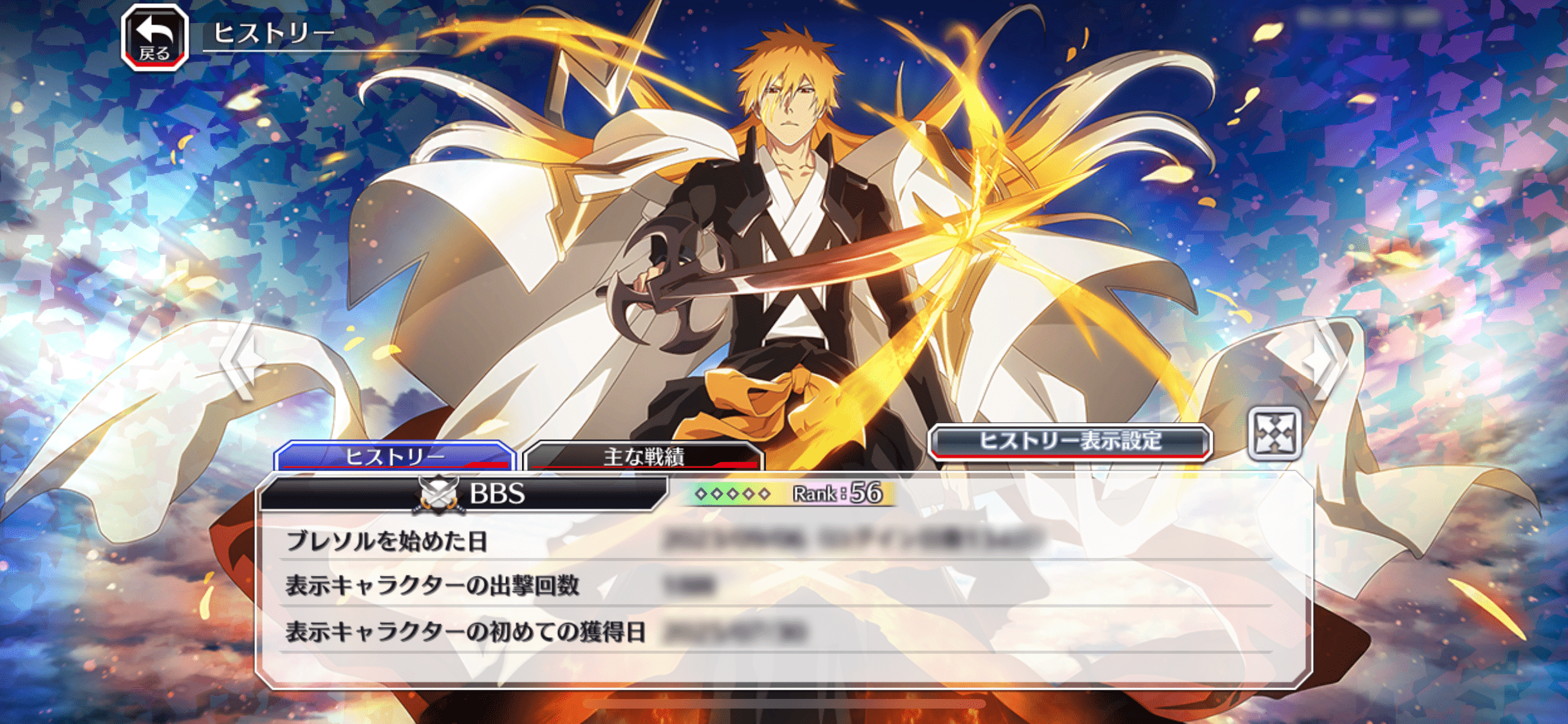・「ヒストリー」タブでは、「ブレソルを始めた日」や、背景に設定している「表示キャラクターの初獲得日」など、あなたのブレソルの思い出を確認できます。