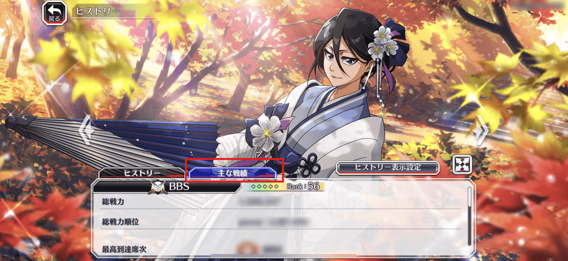 ・「主な戦績」タブでは、「総戦力順位」や「最高到達席次」、「グループバトル最大スコア」など、これまでのあなたの功績を振り返ることができます。