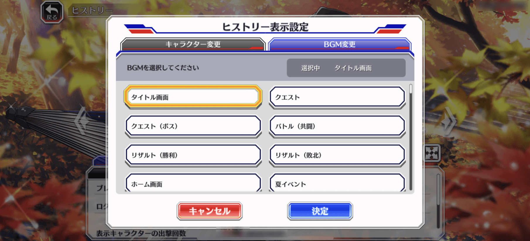・「ヒストリー表示設定」画面から、背景に表示するキャラクターやBGMを自由に変更できます。