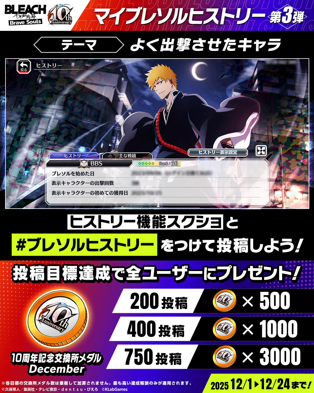 ・報酬の受け取りについては、「BLEACH Brave Souls」アプリ内のプレゼントボックスよりお受け取りください。なお、報酬配布以降にインストールいただいたデータは配布対象外となります。